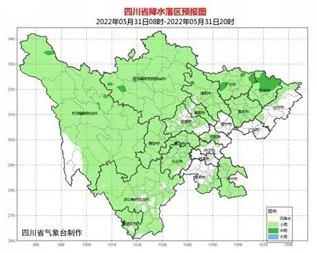 5月31日白天,达州、广安2市多云,盆地其余地方阴天间多云有阵雨或雷雨,其中巴中市有中雨。川西高原和攀西地区阴天间多云有阵雨或雷雨。